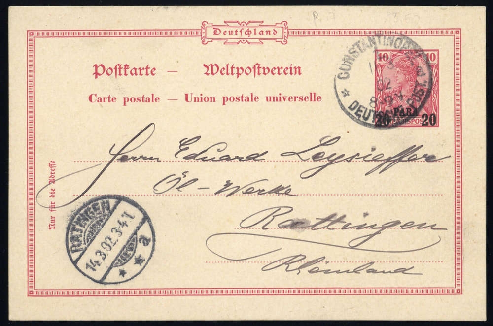 1902, 20P.a.10 Pfg. Germania-GA, bedarfsgebraucht mit Stpl. "CONSTANTINOPEL 11.3.02 DEUTSCHE POST" nach Rattingen mit Ankunftsstpl., leichte Spuren.