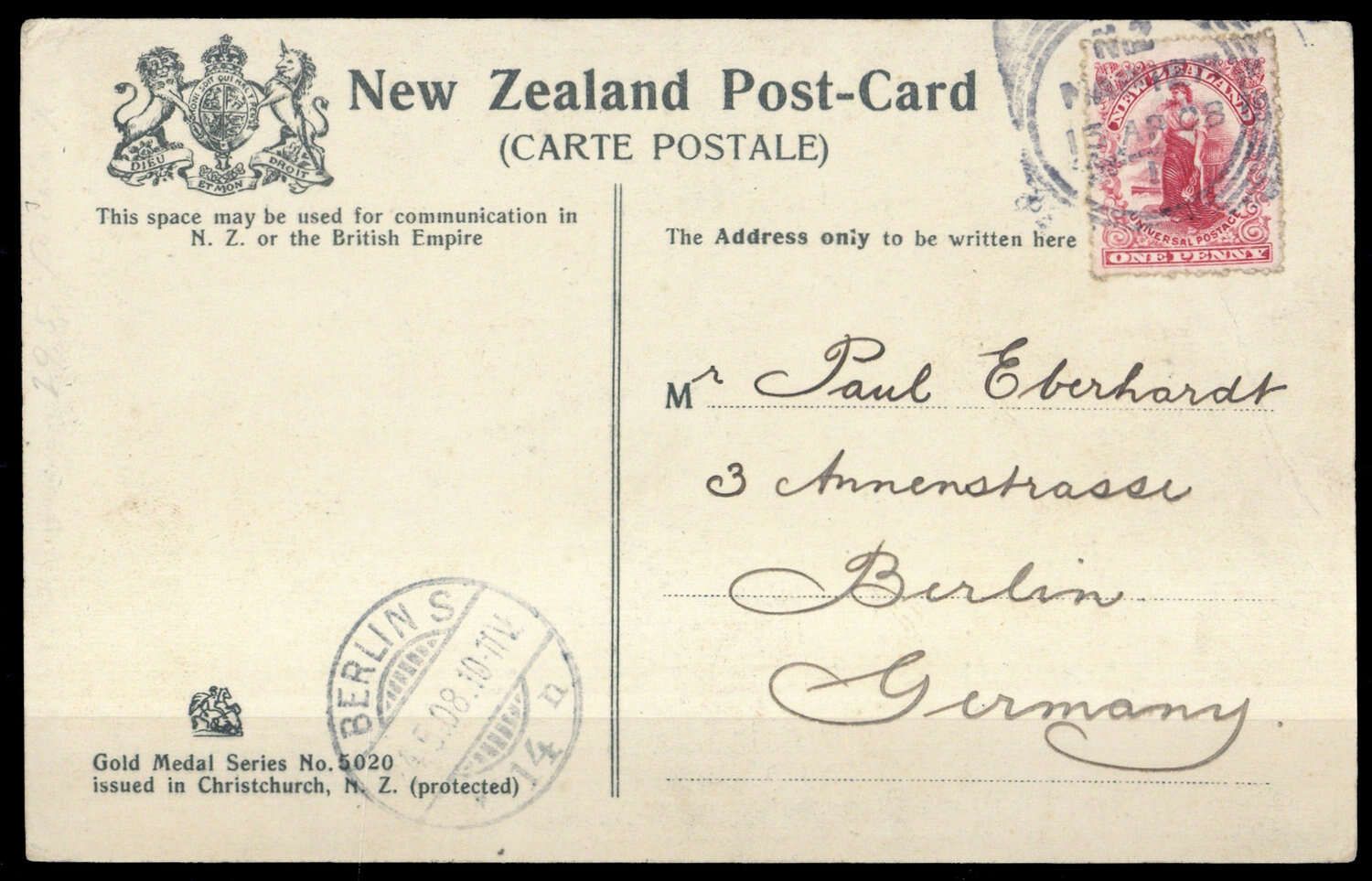 1902, 1 P rot, Quadratstempel "NAPIER 13 AP 08"SANSON 26 OC 08", farbige AK (Napier), Beförderungs- Altersspuren, Ak-DB "BERLIN 24.5.08"
