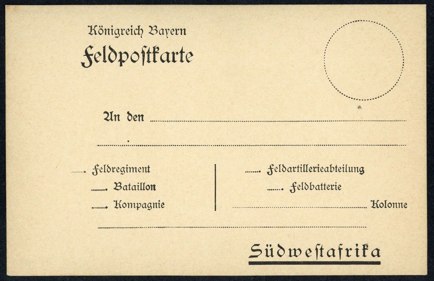 1904, ungebrauchtes Feldpostkartenformular des Königreichs Bayern, rs. Falzreste