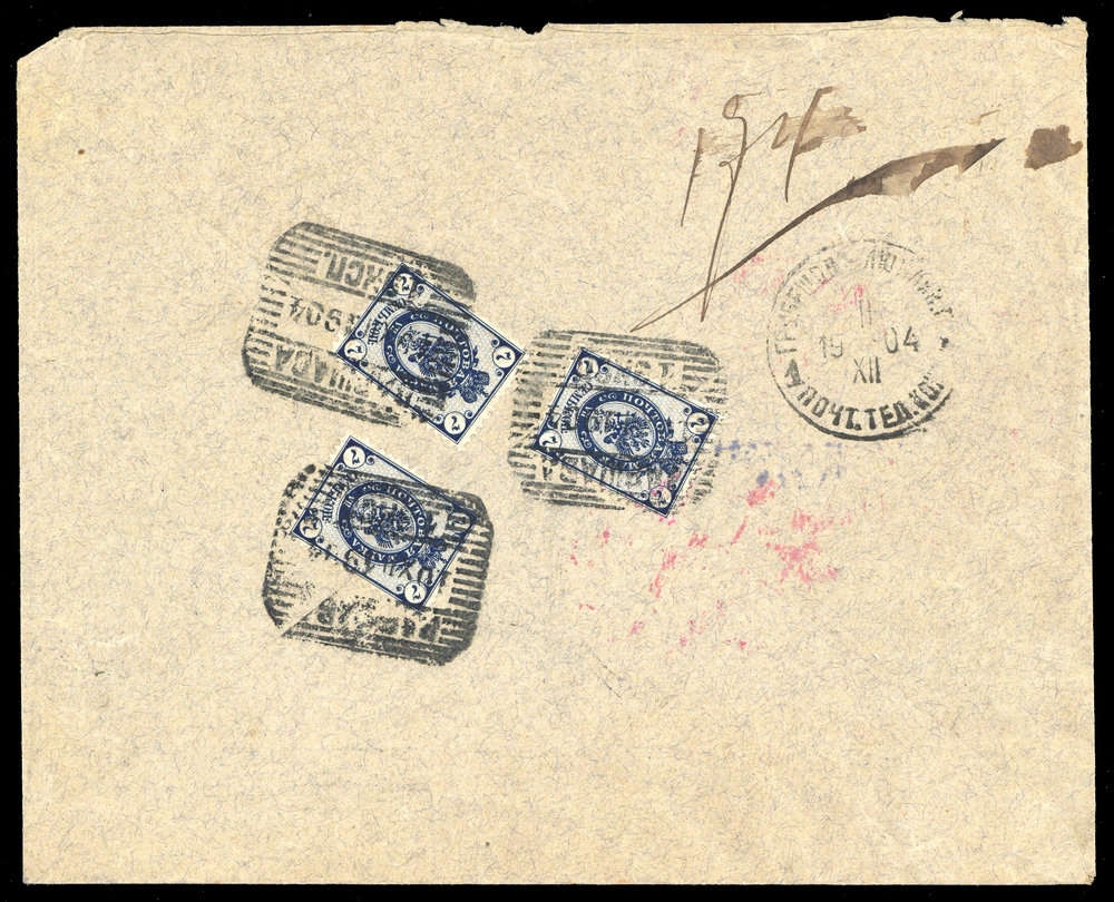 1904, 3 x 7 K rückseitig auf R-Brief vom 10.12.1904 von Warschau mit Ortstempel in rot vorderseitig, Beförderungsspuren.