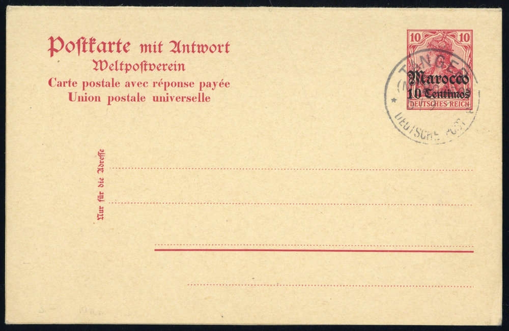 1905, 10C.a.10 Pfg. Germania, F/A-GA-Karte mit Gefälligkeitsstempel "TANGER", saubere Erhaltung.