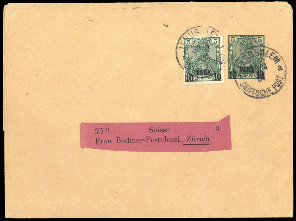 1905, 10P.a.5 Pfg. Germania-Streifband mit Nr. 12I Zusatzfrankatur, zweimal Stpl. "JERUSALEM 30.4.04 DEUTSCHE POST" mit Adressaufkleber nach Zürich / Schweiz, leichte Alterungsspuren.