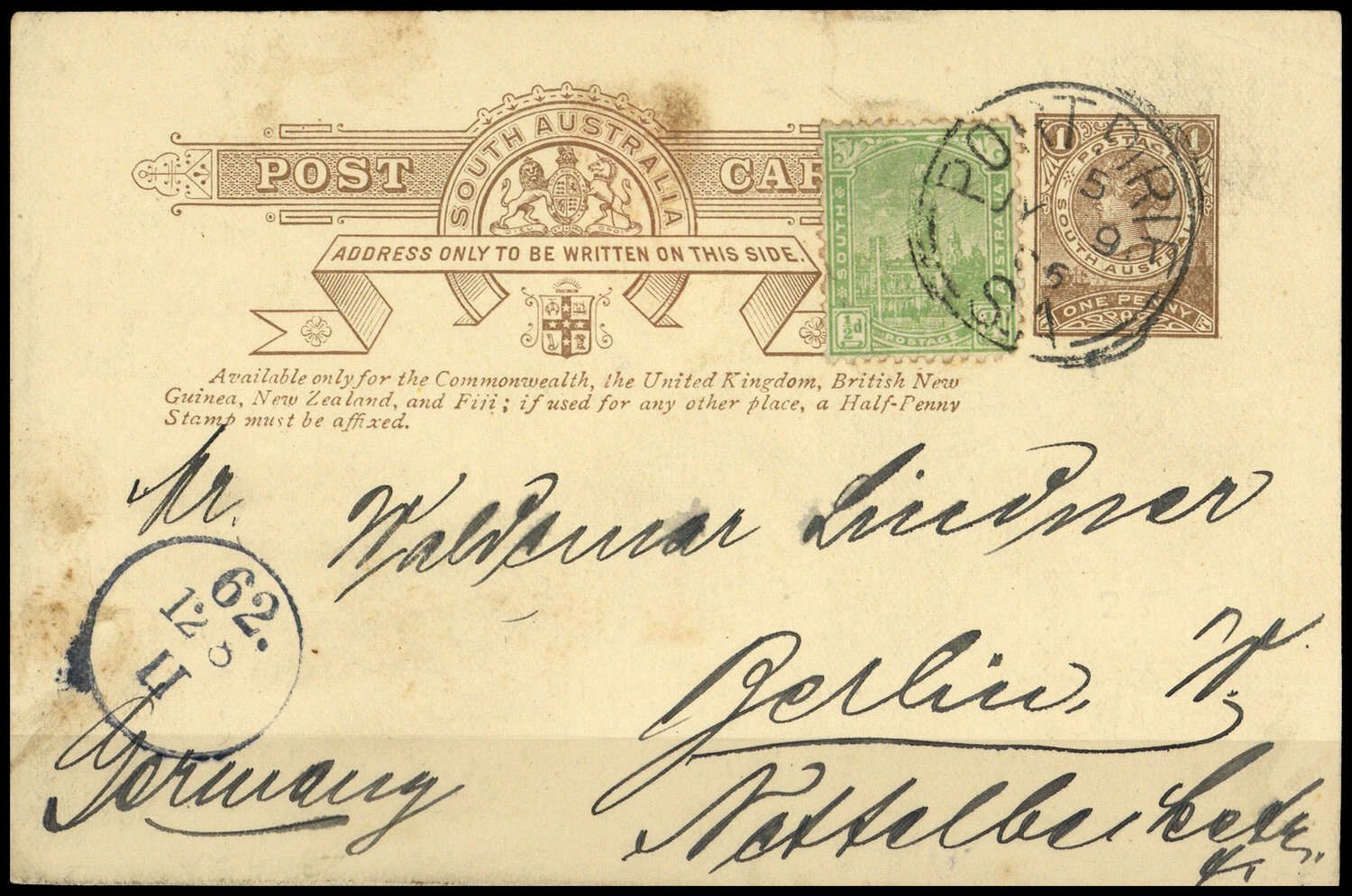 1905, 1 P braun/sämisch, GSK Viktoria, 1/2 P grün Zusatz (Mängel), K1 "PONT PIRIE JY 9 05", Beförderungs- Alters-, Papierklebespuren, nach Berlin, Ak "62. 12 8"