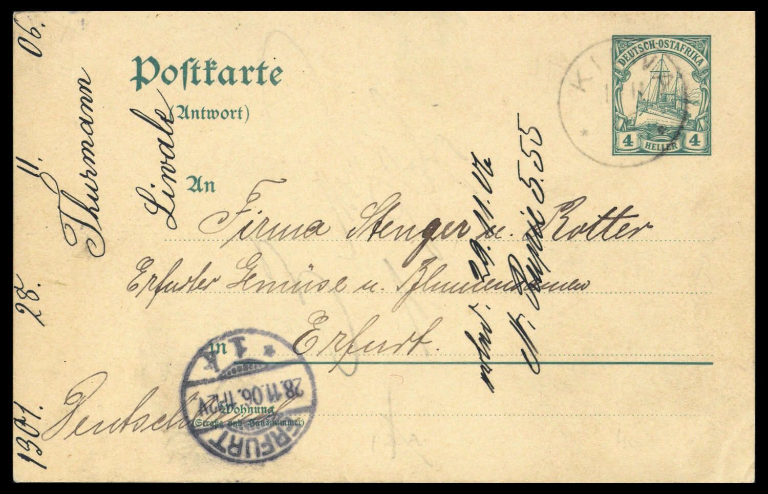 1906, 4 H. Schiffszeichnung - Ganzsache, bedarfsgebraucht von KILWA (1906) nach Erfurt mit Ankunftsstpl. "28.11.06", vorderseitig weitere hds. Vermerke, leichte rs. Befestigungsspuren.