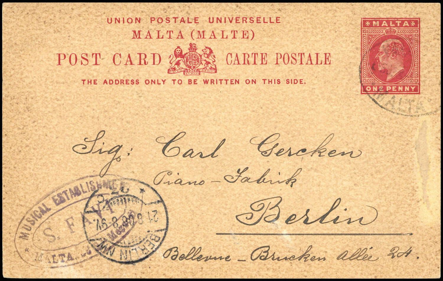1906, 1 P Edward VII vom 17.08.1906 von Malta mit schwachem Ovalstempel Valletta nach Berlin, vs.Haftstellen, Altersspuren