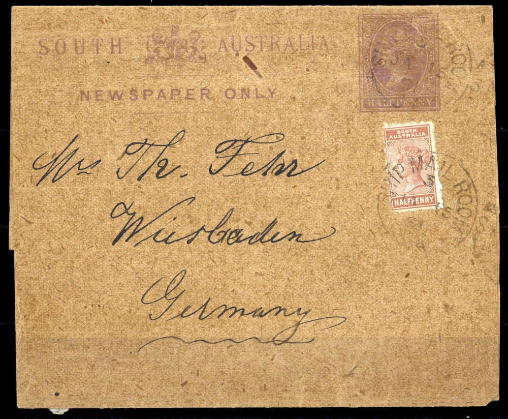 1906, 1/2 P violett/hellsämisch, GS-Streifband Viktoria-Oval, senkr. Faltung, Knitter, 1/2 P hellgrün Zusatz, K2 "ADELAIDE JY 15 0.", Beförderungsspuren nach Wiesbaden