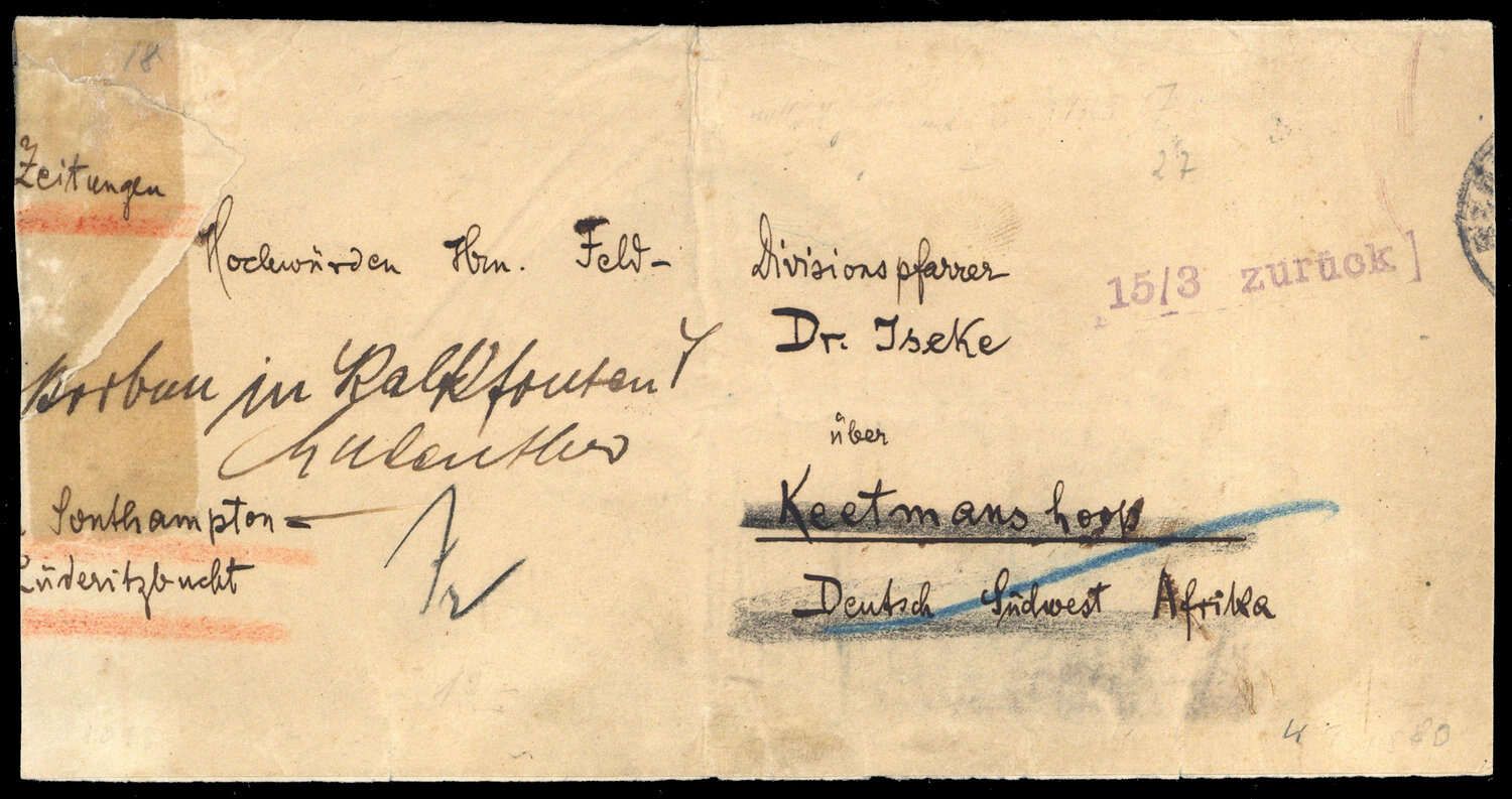 1907, Brief (dreiseitig geöffnet / stark beschnitten) aus CHARLOTTENBURG (entsprechender Absenderstpl.) nach Keetmanshoop / DSWA mit diversen hds. Weiterleitungsvermerken, rs. Ankunftsstpl. "WINDHUK DEUTSCH-SÜDWESTAFRIKA 15/3 07", stärkere Beförderungsspuren.