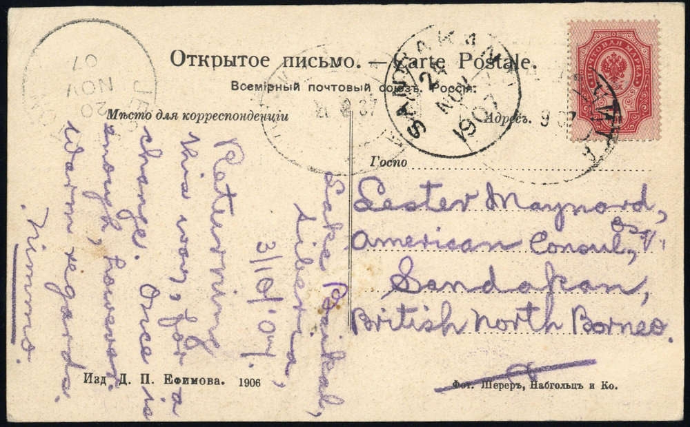 1907, 4 K. Wappen auf AK "Baikalsee" mit Ovalstempel nach Sandakan (Britisch Nord Borneo) mit Ankunftsstempel, interessante Destination !