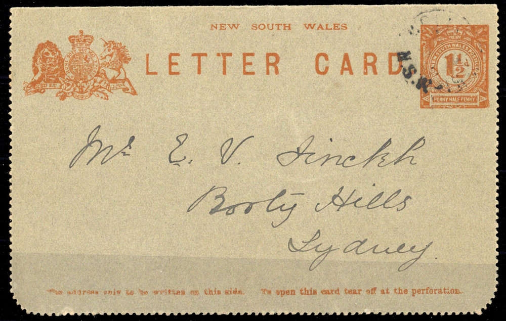 1908, 1 1/2 P rotorange/grau, Kartenbrief Ziffer-Kreis, ohne Rand, innen dunkelrosa, ".. (April 24 11)", Beförderungsspuren, nach Sydney