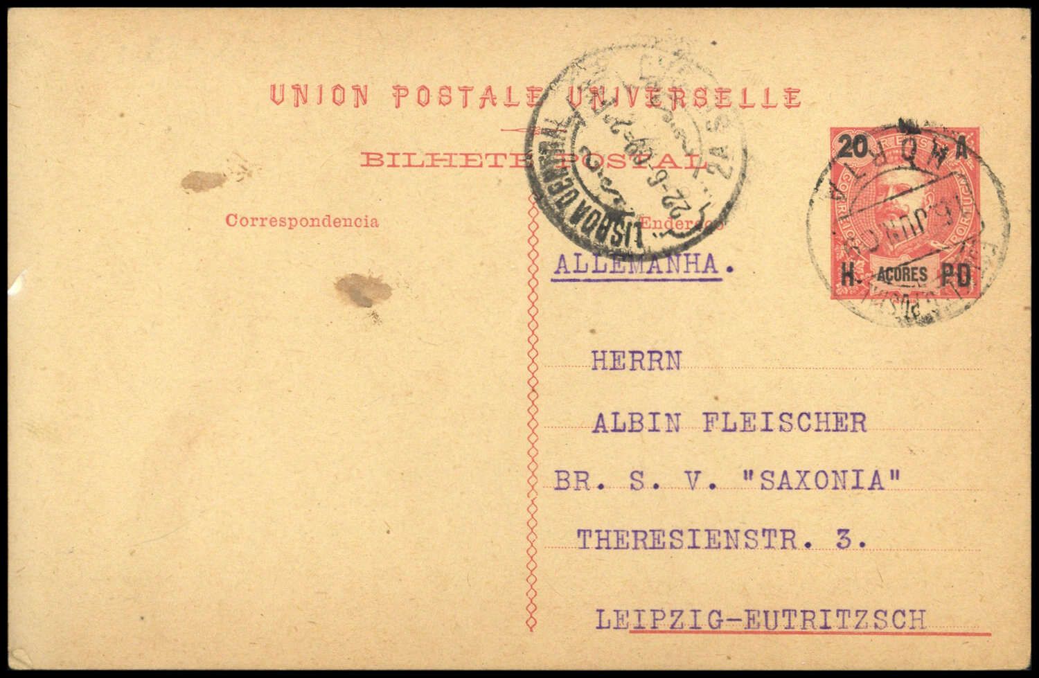 1909, 20 R König Carlos mit Aufdruck Acores vom 16.06.1909 von Horta nach Leipzig, rs. Haftstellen