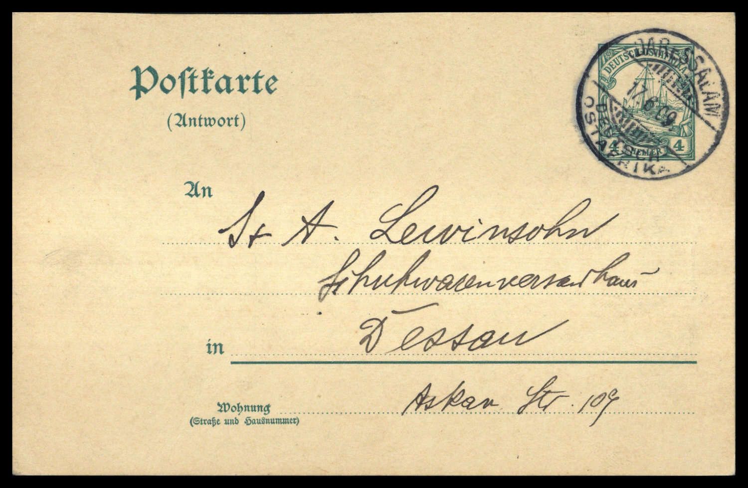 1909, 4 H. Schiffszeichnung - Antwort-Ganzsache, bedarfsgebraucht von DARESSALAM DEUTSCH-OSTFRIKA 17.6.09 nach Dessau, leichte Spuren.