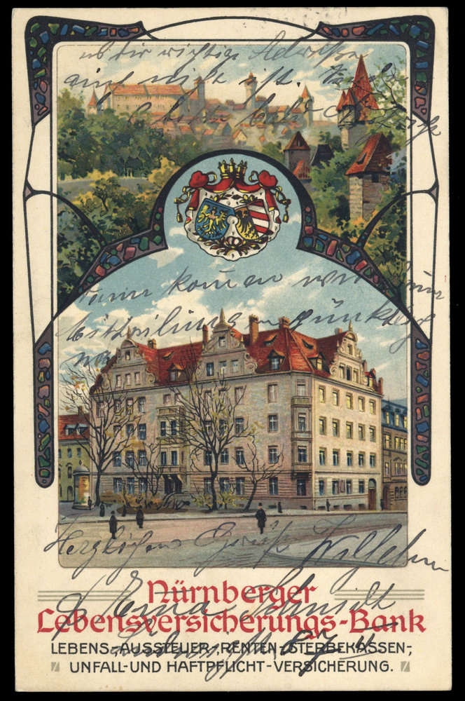 1910, farbige, dekorative Postkarte (Nürnberg Lebensversicherungs-Bank - Ansichten), bedarfsgebraucht mit 5 Pfg. Staatswappen frankiert nach München, viel Text auch vorderseitig.