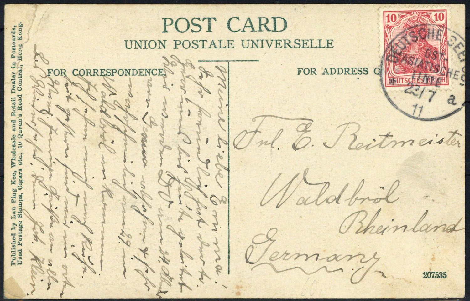 1911, "Deutsche Seepost Ost - Asiatische Linie 23 7 11 a)", auf 10 Pf Germania, farbige AK (Bergstühle und Rikschas), Eckbug, Alters- Beförderungsspuren, nach Waldbröl