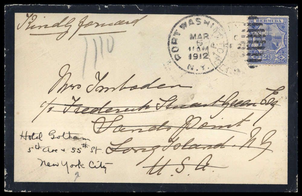 1912, 2 1/2 P Freimarke auf Auslands Trauerbrief vom 27.02.1912 von Hamilton nach Long Island und nachgesandt nach New York mit vorderseitigen Eingangsstempel von Port Washington, Rücklasche fehlt