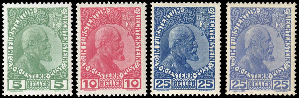 1912, 5 bis 25 H. Fürst Johann in der guten Type "y" auf normalem Papier sauber ungebraucht und der Wert zu 25 H. zudem in beiden Farben "a" und "b" (ME 1.290.-)