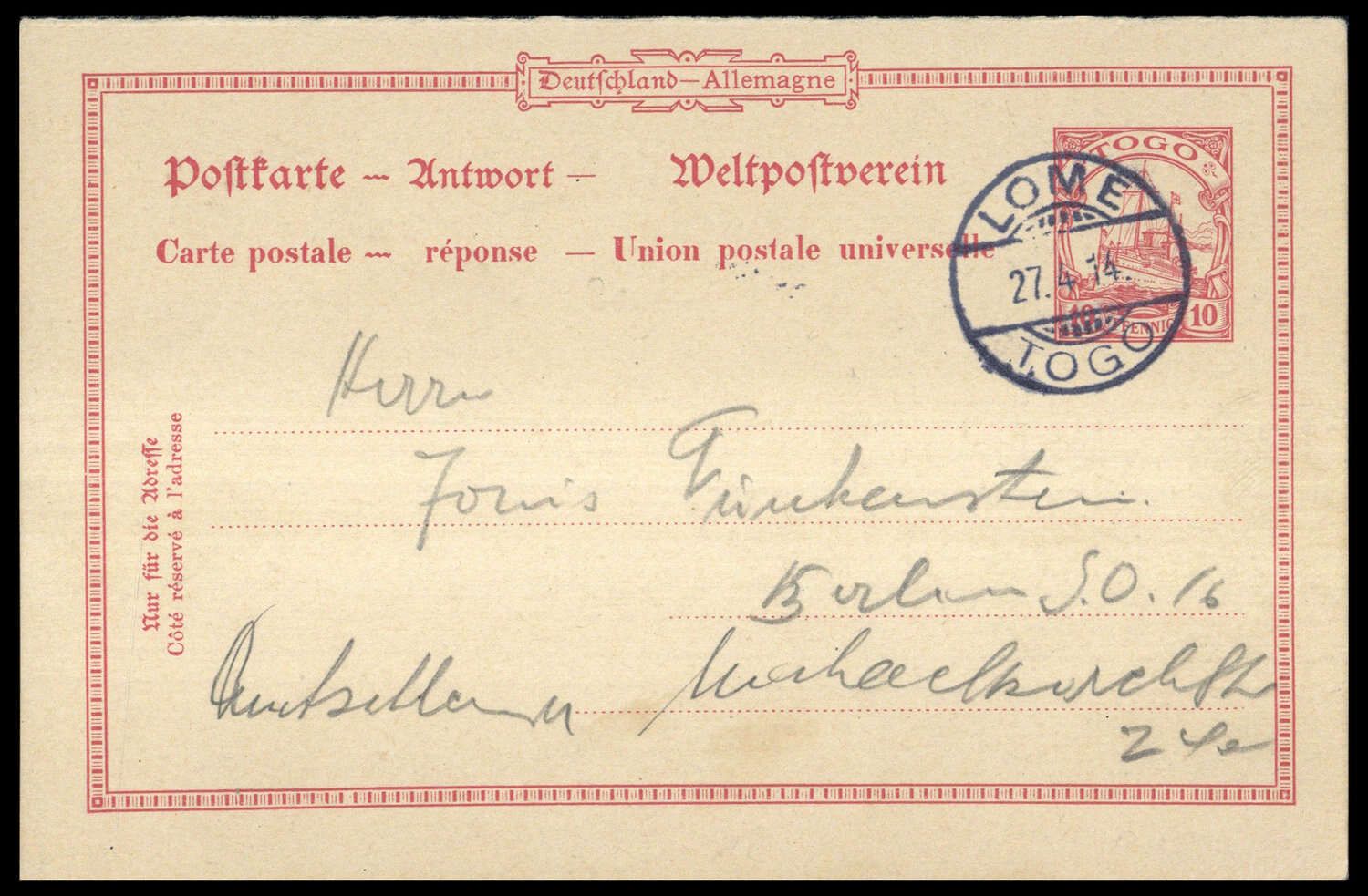 1914, 10 Pfg. Schiffszeichnung - Antwort-Ganzsache mit Stpl. "LOME TOGO 27.4.14" nach Berlin, kein Ankunftsstpl. + rs. Text.