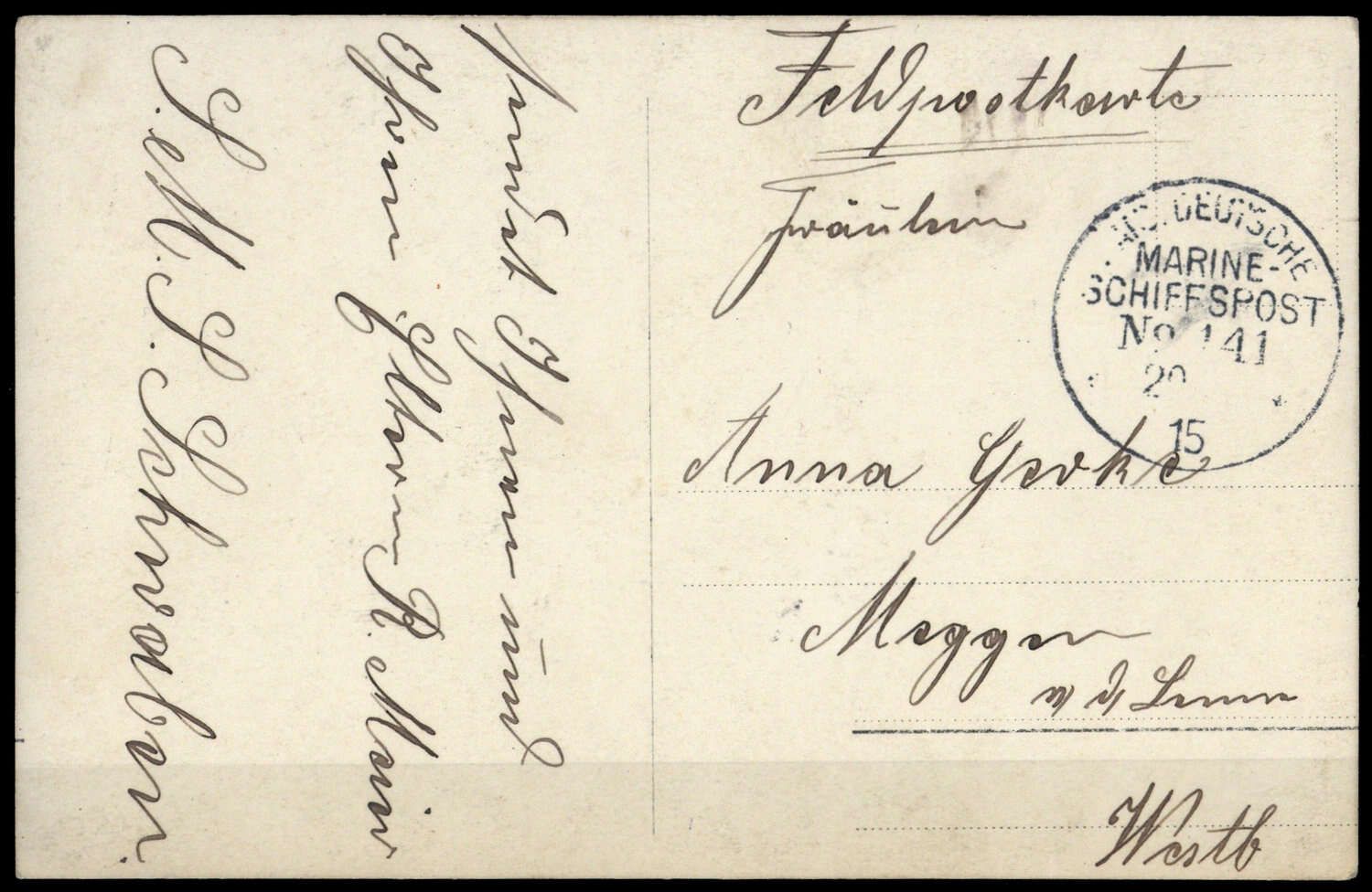 1915, "K.D.M.S.P. No."41" 20....15", K1 auf sw Feldpost-AK (Weihnachtsgrüsse, SMS Schwaben), Beförderungsspuren, nach Meggen a.d. Lenne