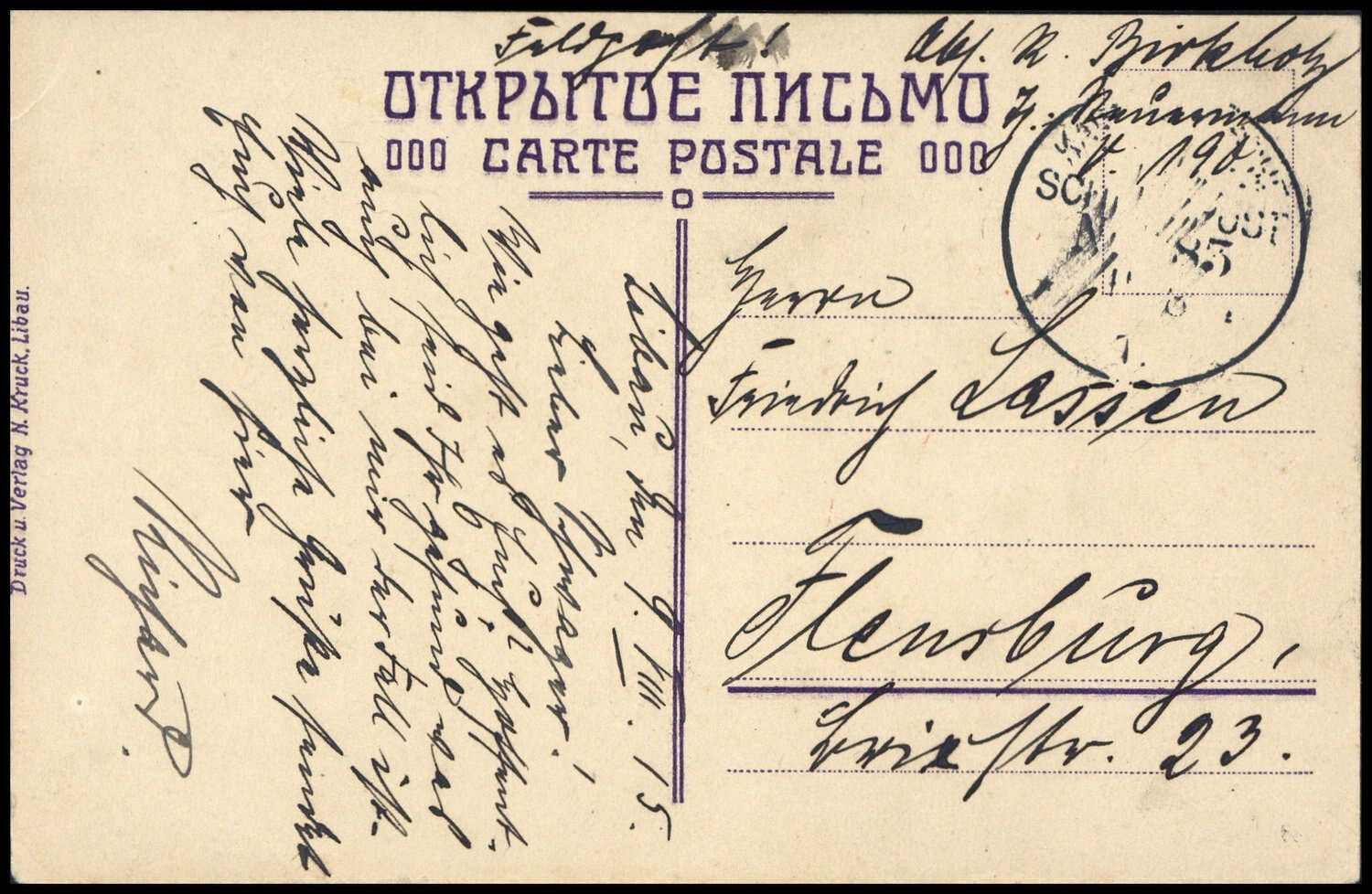 1915, "K.D.MSP No.83 9 8 1(5)", K1 auf Marine-Feldpost-AK (Libau Kathedrale), Alters- Beförderungsspuren, nach Flensburg