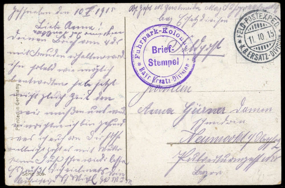 1915, farbige Postkarte mit Stpl. "FELD-POSTEXPED. 11.10.15 K.B. ERSATZ-DIVISION" nach Neumarkt, violetter Briefstpl. "Fuhrpark-Kolonne - Bayr. Ersatz-Division", leichte Spuren und links leichte Randfehler.