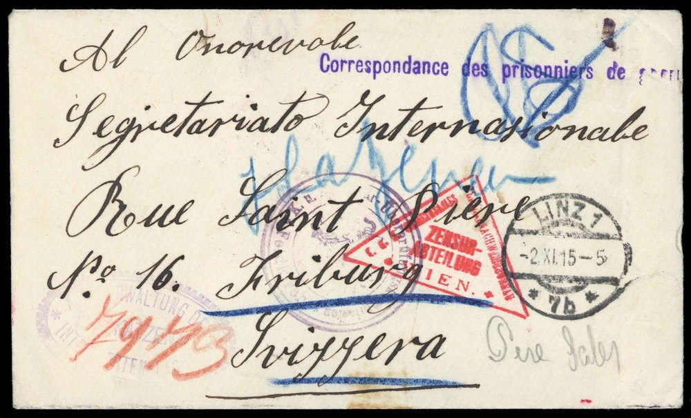 1915, viol. L1 "Correspondance des prisonniers de guerre", DB "LINZ 2.XI.15", Brief Beförderungs- Altersspuren, österr. Zensuren, Alters- Beförerungsspuren, an das RK Fribourg "25.XI.15"
