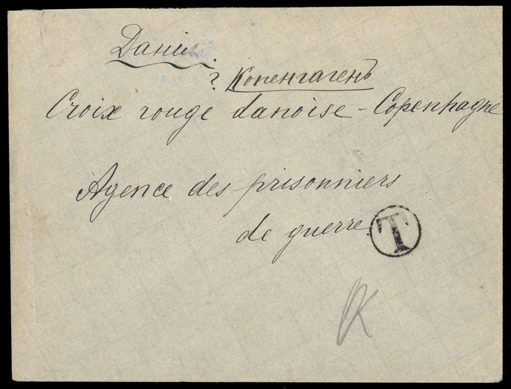 1915, Kriegsgefangenen-Brief, an das dänische Rotekreuz in Kopenhagen, aus Russland, K1 "T", Beförderungsspuren, rs. Ak-K1 "KOPENHAGEN 31.5.15"