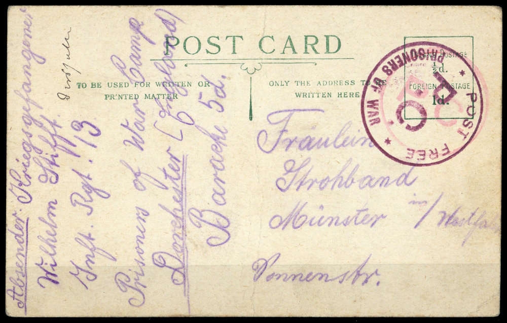 1915, Kriegsgefangenenkarte, mittig senkr. Faltung, L1 "DORCHESTER", roter K1 "P.C. POST FREE PRISONERS OD WAR", Beförderungs- Altersspuren, nach Münster