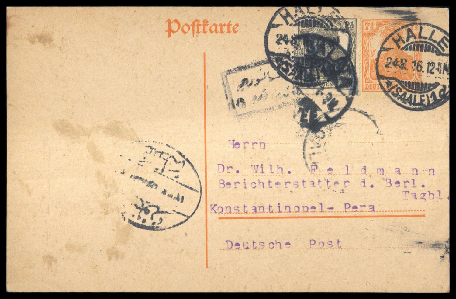 1916, DR 7 1/2 Pfg. Germania-Ganzsache mit Nr. 98 Zusatzfrankatur von HALLE (SAALE) 24.8.16 nach Konstantinopel / Deutsche Post mit verschiedenen Ankunftsstpl., Alterungsspuren.