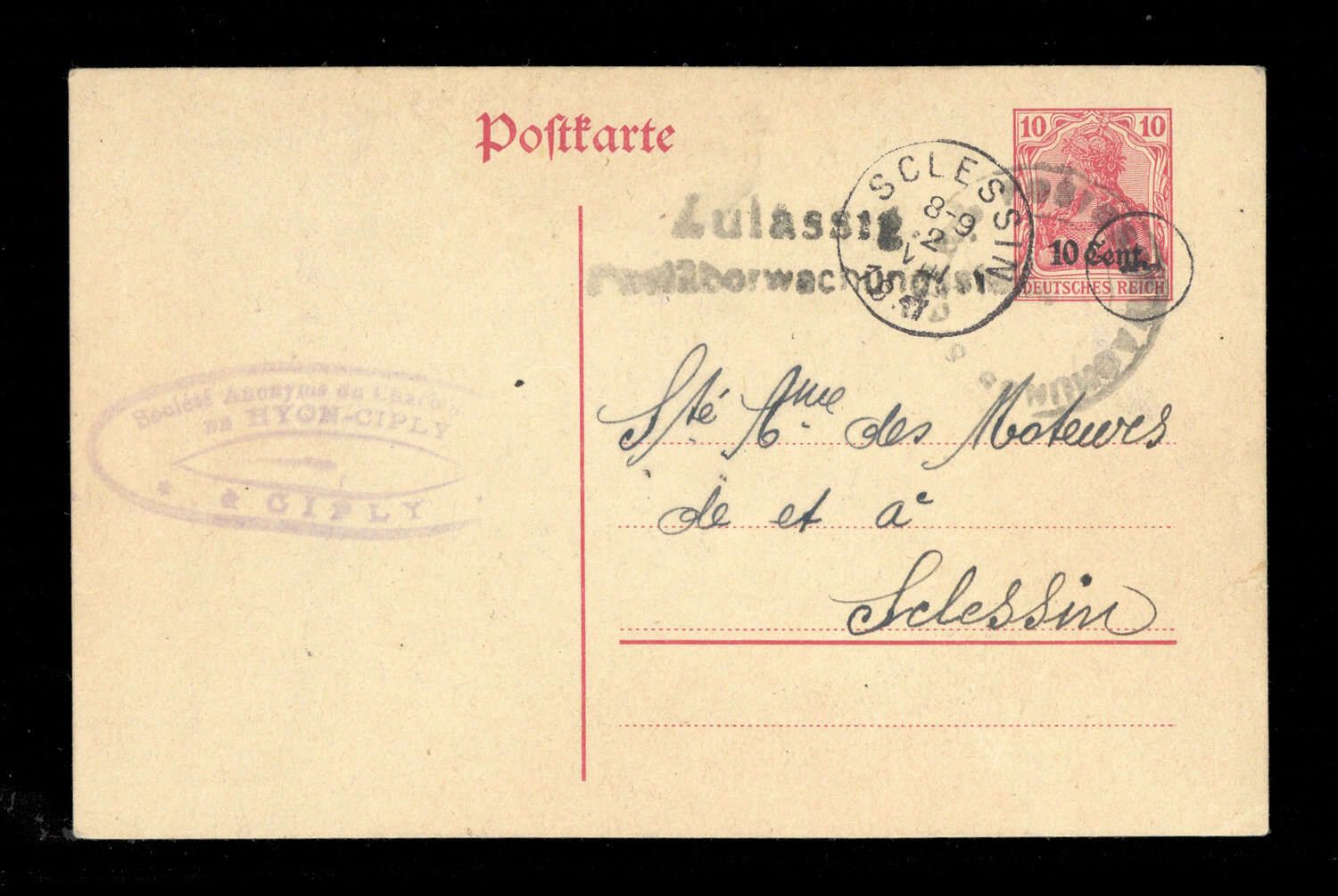 1917, 10 Pfg. Germania-Ganzsache, bedarfsgebraucht mit schwachem Poststempel entwertet nach Schlessin mit Ankunftsstempel über Wertstempel, ferner Zensur-Zweizeiler, Briefträgerstpl. + Absenderstpl. "CIFLY", rechts kleiner Einriss, leichte Beförderungsspuren.