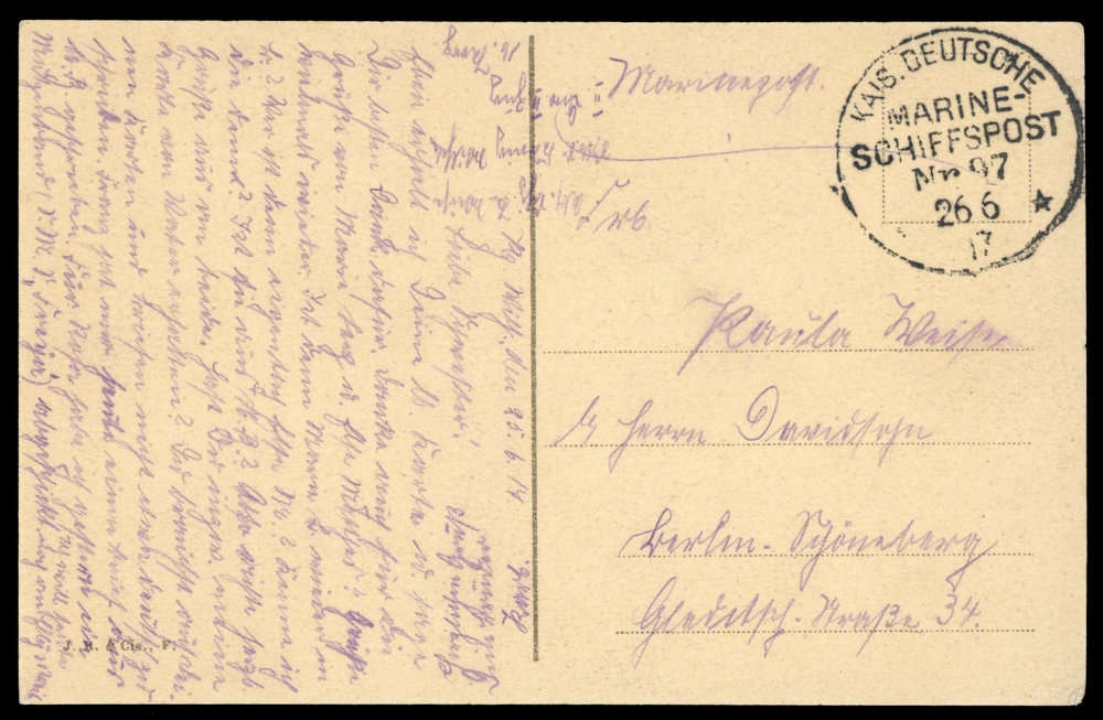 1917, Feldpostkarte (Flensburg - Hafenpartie) mit Stempel "KAIS.DEUTSCHE MARINE-SCHIFFSPOST No.97 - 26.6.1917", adressiert nach Berlin-Schönberg.