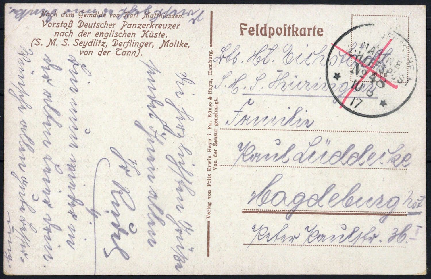 1917, "K.D.M.S.P "48" 10.8.17" (SMS Thüringen), klarer K1 auf farbiger AK (Vorstoß von Panzerkreuzern), als Feldpostkarte, Eckbug, Beförderungsspuren, nach Magdeburg