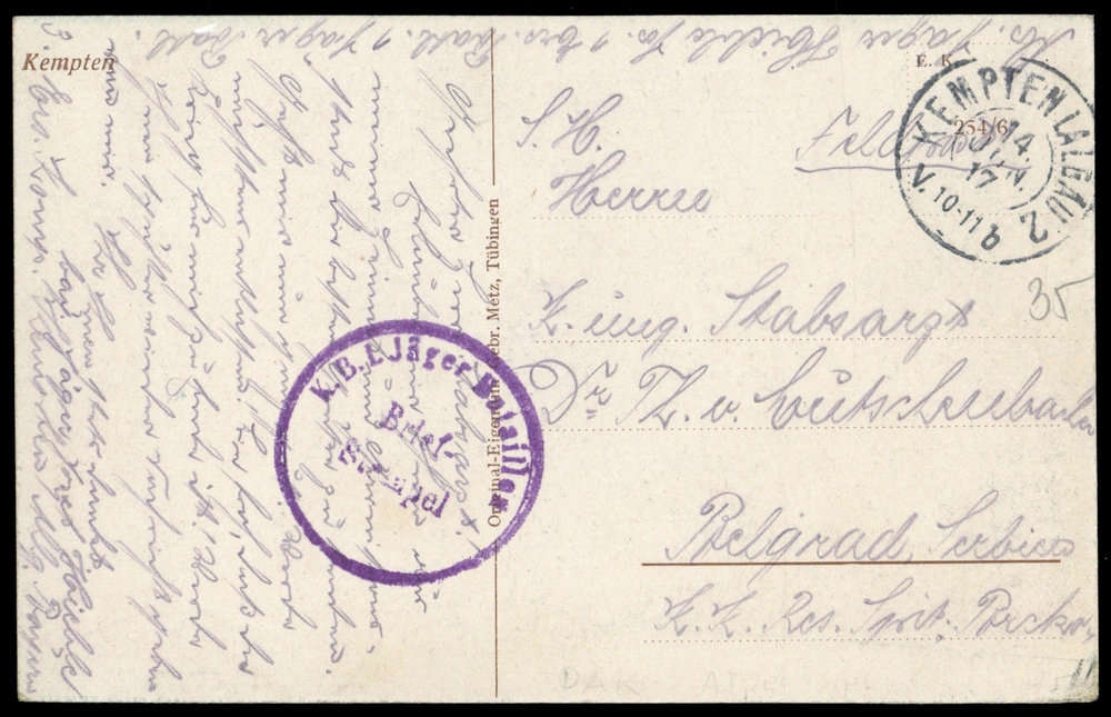 1917, farbige Postkarte (Stadtansicht Kempten) mit Stpl. "KEMPTEN ALLGÄU 14.6.17" nach Belgrad, violetter Briefstpl. "K.B. I. Jäger Bataillon", leichte Spuren.
