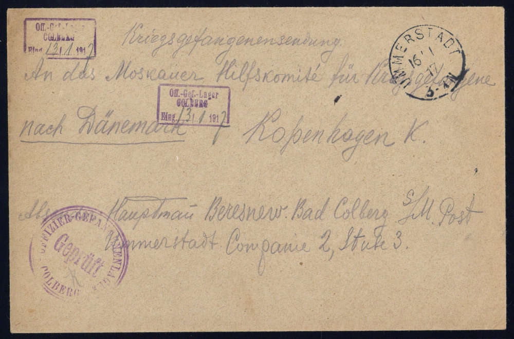 1917, hs. "Kriegsgefangenensendung", Brief mit K1 "UMMERSTADT 16 1 17", 2x viol. Ra3 "Off.-Gef.-Lager COLBERG 13.1.1917" + Geprüft-K2, an das Rote Kreuz Kopenhagen, Beförderungs- Altersspuren