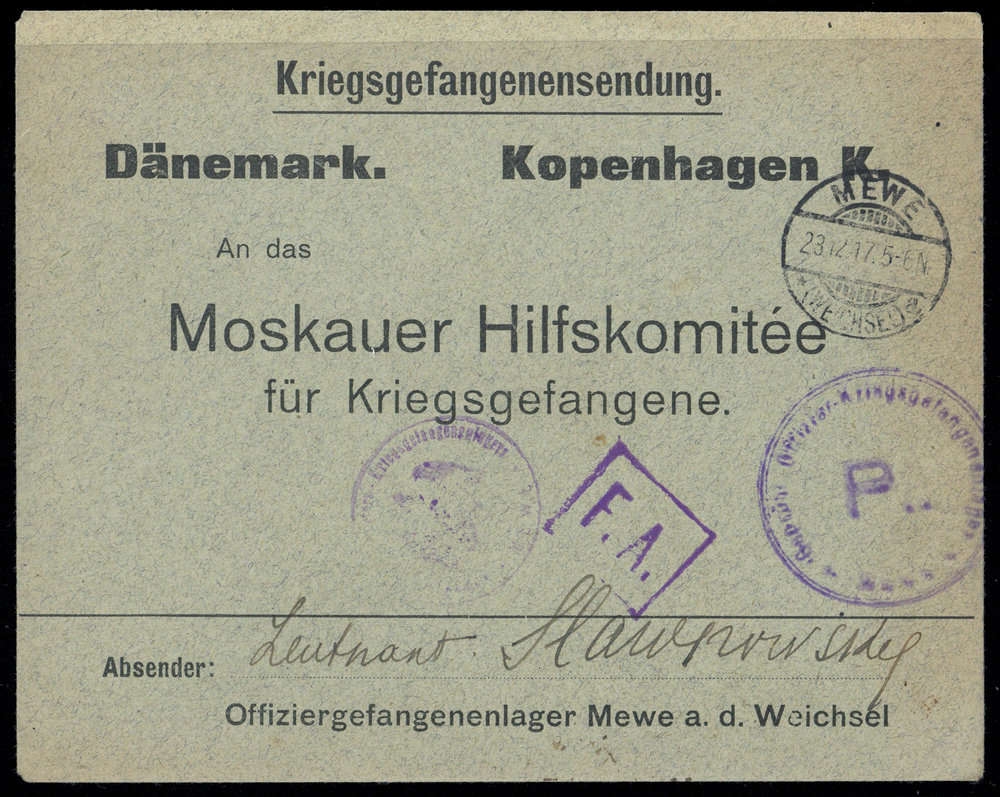 1917, "Kriegsgefangenensendung Dänemark. Kopenhagen K.", Vordruckbrief: "Offiziergefangenenlager Mewe a.d. Weichsel", DB "MEWE 23.12.17", violette Zensuren, ans Moskauer Hilfskomitée in Kopenhagen, Beförderungs- Altersspuren