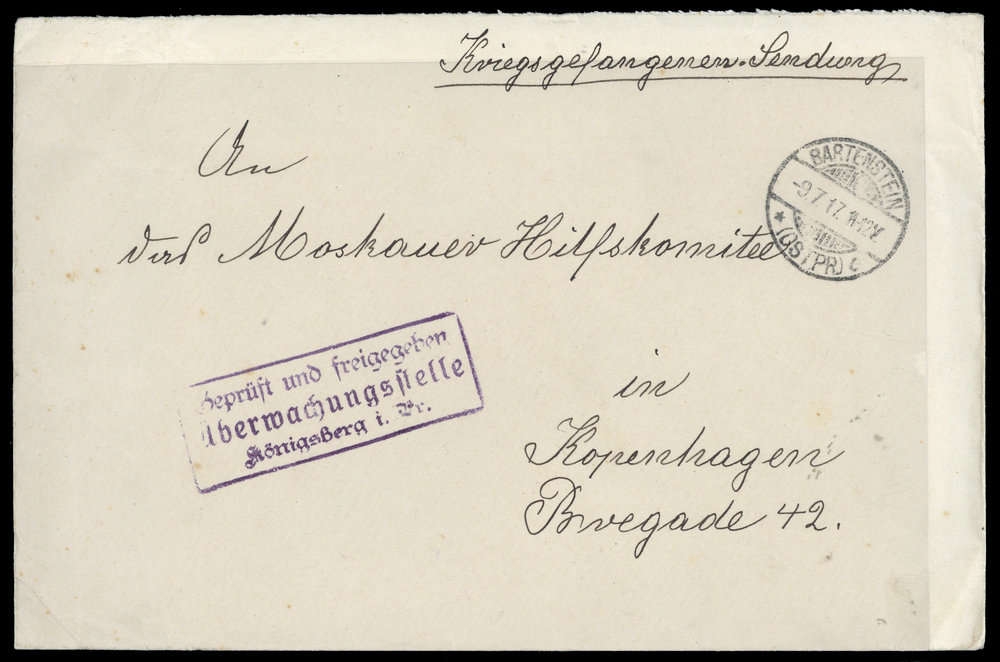 1917, hs. "Kriegsgefangenensendung", Brief Faltungen, Randknitter, Altersspuren, DB "BARTENSTEIN 9.7.17", viol. Überwachungs-Ra3 "Königsberg", an das Moskauer Hilfskomitee in Kopenhagen