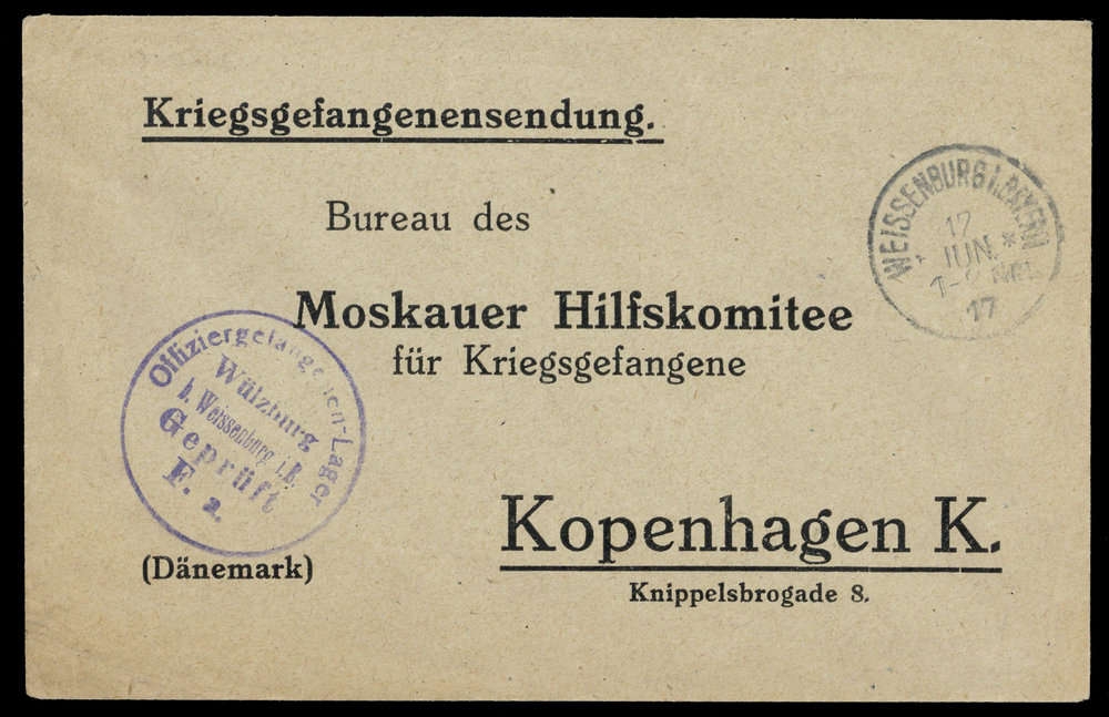 1917, KGF-Vordruckumschlag von "Weissenburg 17 Jun 17" nach Kopenhagen aus dem Offiziersgefangenenlager Wülzburg
