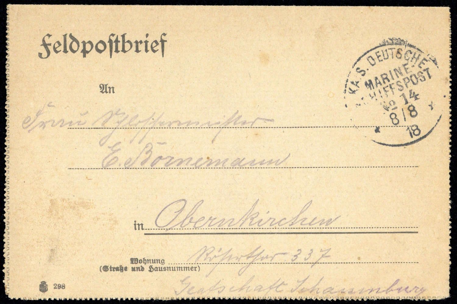 1918, Feldpost-Faltkartenbrief (ohne Rand) mit Stpl. "MSP 14 - 8/8 18" nach Obernkirchen, Absender "Marine-Kommando Türkei", leichte Alterungsspuren.