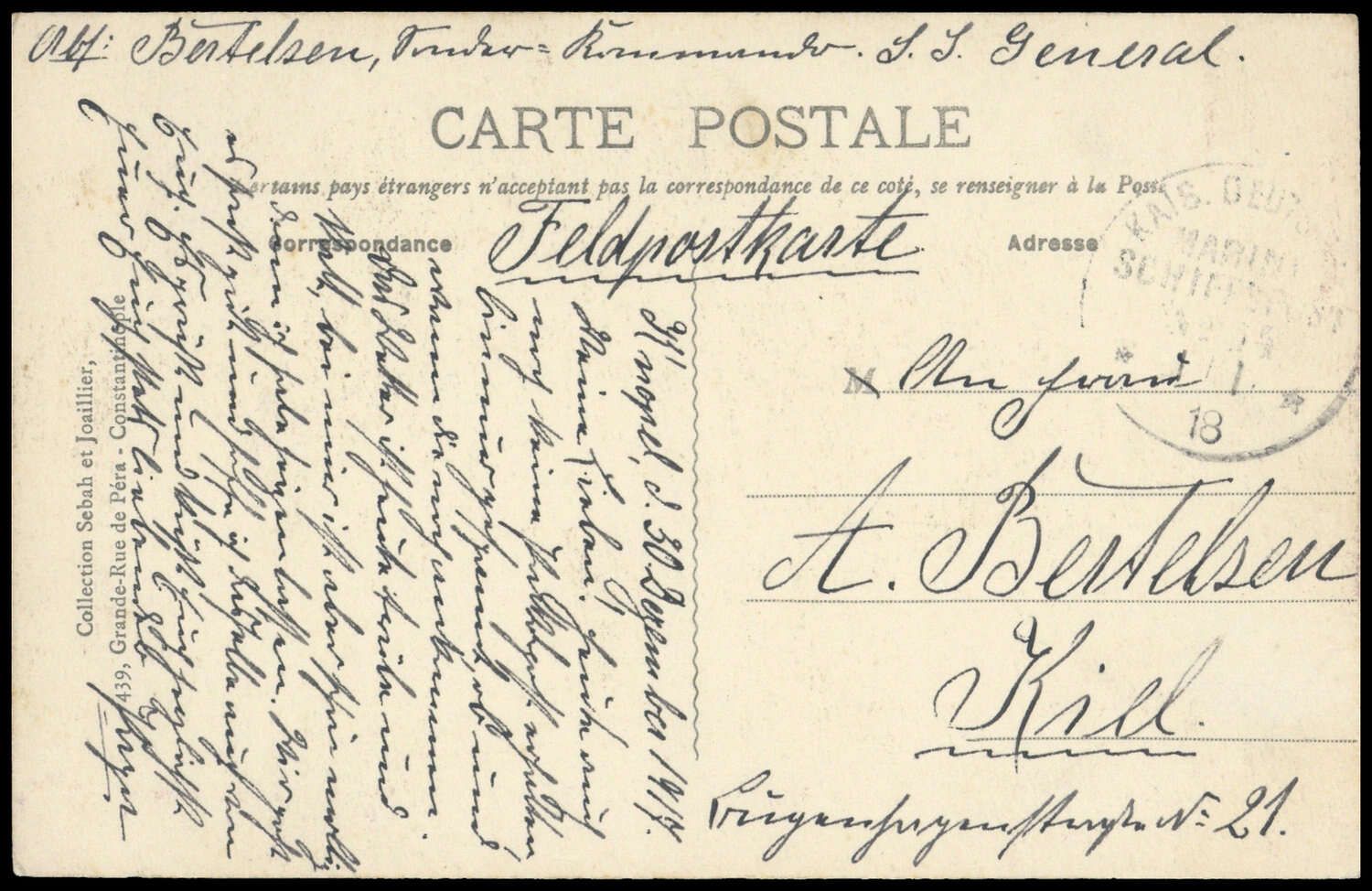 1918, Feldpostkarte (Constantinopel) mit schwachem Stpl. "MSP 1 1 18" nach Kiel, Absender S.S. General, leichte Spuren.