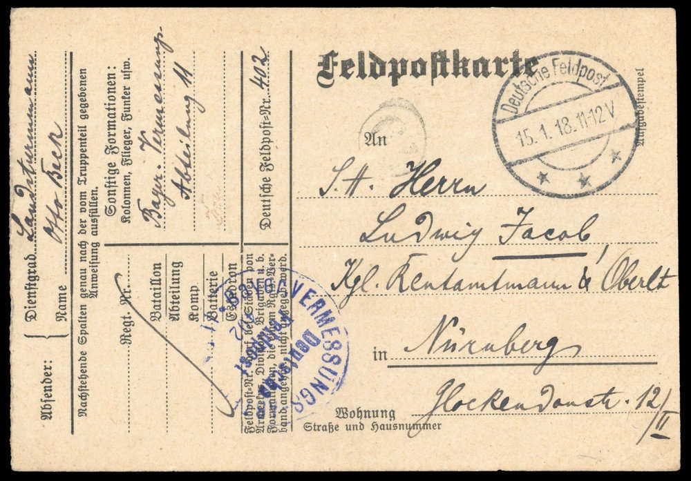 1918, vorgedruckte Feldpostkarte mit Stpl. "Deutsche Postpost 15.1.18" nach Nürnberg, blauer Briefstpl. "Bayer. VERMESSUNGS-ABTL. 402", leichte Spuren.