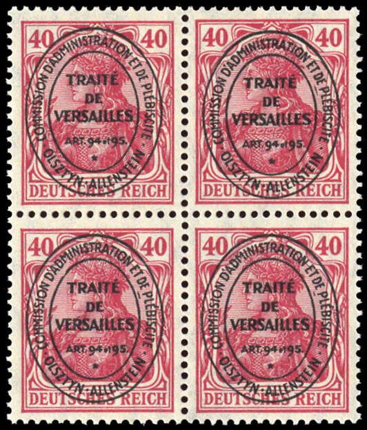1920, 40 Pfg. Germania mit Überdruck taufrisch postfrisch als nicht mehr zur Ausgabe gelangte Freimarke im 4-er Block (ME 1.040.-)