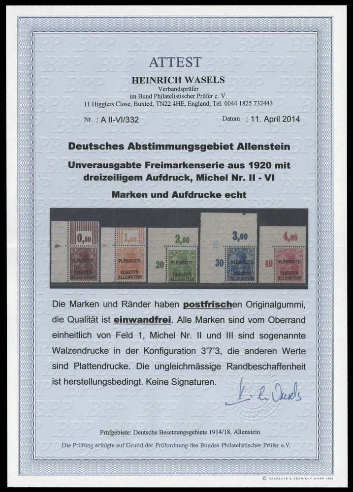 1920, 5 Werte Germania mit Überdruck taufrisch postfrisch als komplette nicht mehr zur Ausgabe gelangte Freimarkenserie alle aus der Bogenecke links oben. 5 und 10 Pfg. vom Walzen-Oberrand die anderen 3 Werte als Platten-Oberrandstücke. Aktuelles Farbfotoattest von dem Experten Wasels BPP vom 11.4.2014 in der höchsten Qualitätsstufe "echt und einwandfrei" ohne Signaturen (ME 2.000.-++)
