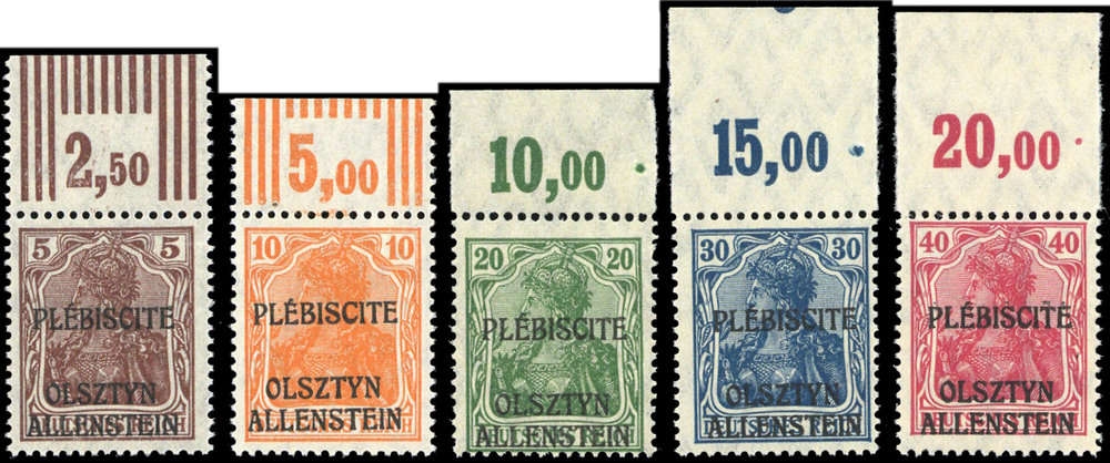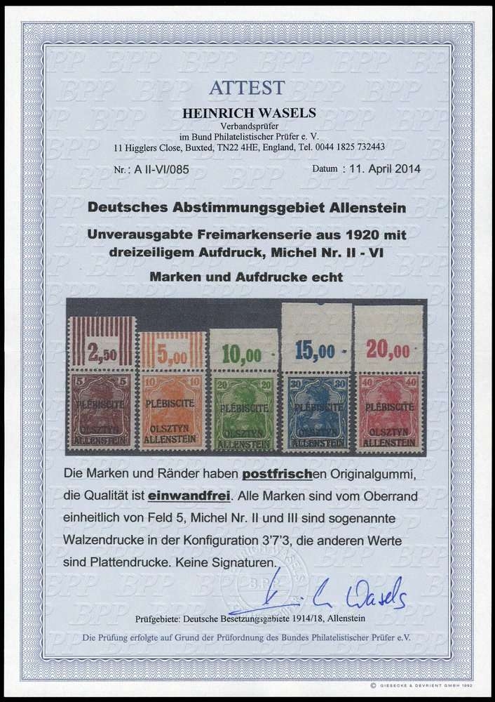 1920, 5 Werte Germania mit Überdruck taufrisch postfrisch als komplette nicht mehr zur Ausgabe gelangte Freimarkenserie alle vom Oberrand. 5 und 10 Pfg. vom Walzen-Oberrand die anderen 3 Werte als Platten-Oberrandstücke mit Farbpunkten neben der Reihenwertzahl. Aktuelles Farbfotoattest von dem Experten Wasels BPP vom 11.04.2014 in der höchsten Qualitätsstufe "echt und einwandfrei" ohne Signaturen (ME 2.000.-+)