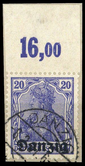 1920, 20 Pfg. Germania auf Briefstück als ndgz. Platten- Oberrandstück