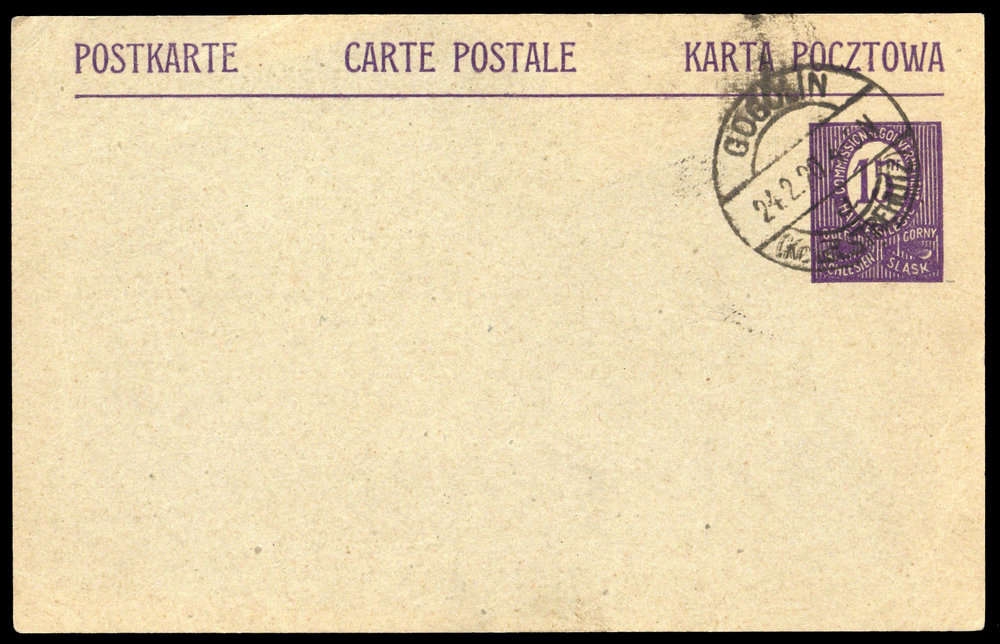 1920, 15 Pfg. Ziffer, Ganzsache, mit Stpl. "GOGOLIN 24.2.20", leichte Randspuren, Stempel unsauber.