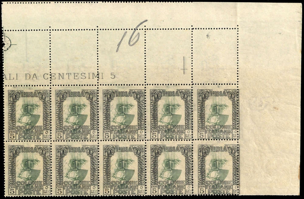 1921, 5 C. Freimarke Antike "Legionär" im tadellos postfrischen Eckrand 10-er Block r.o. alle mit kopfstehendem Mittelstück. Davon 5 Stück sogar mit anhängendem Leerfeld. Im Michel 2016/2017 ist nur deren Existenz notiert, ohne Preisnotierung! (Sassone Nr. 23 c / ca. 1.500.- Euro ++)