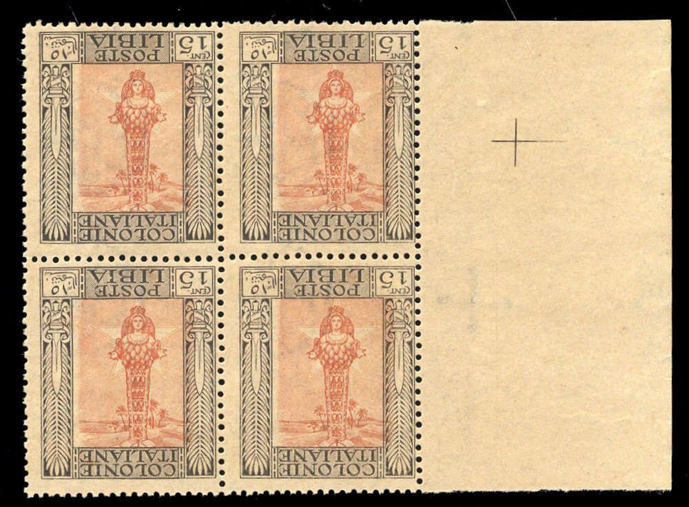 1921, 15 C. Freimarke Antike "Diana von Ephesus" im tadellos postfrischen Seitenrand 4-er Block alle mit kopfstehendem Mittelstück. Im Michel 2016/2017 ist nur deren Existenz notiert, ohne Preisnotierung! (Sassone Nr. 25 c / ca. 1.280.- Euro)