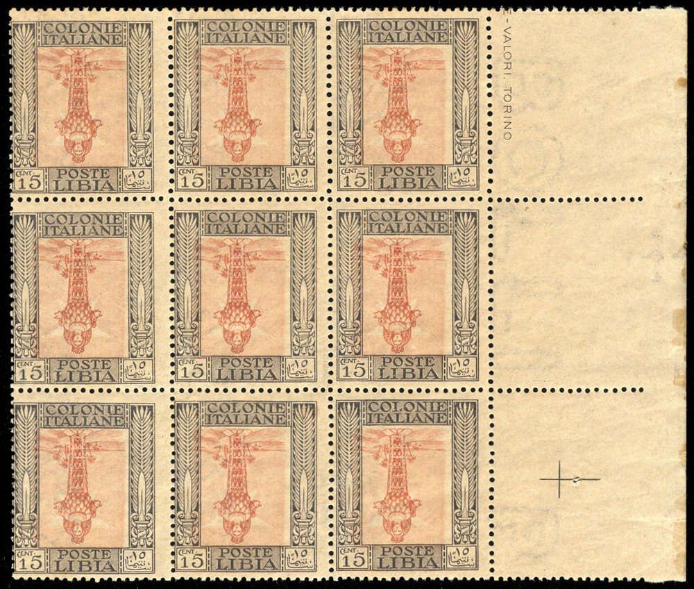 1921, 15 C. Freimarke Antike "Diana von Ephesus" im tadellos postfrischen Seitenrand 9-er Block alle mit kopfstehendem Mittelstück. Im Michel 2016/2017 ist nur deren Existenz notiert, ohne Preisnotierung! (Sassone Nr. 25 c / ca. 2.880.- Euro)