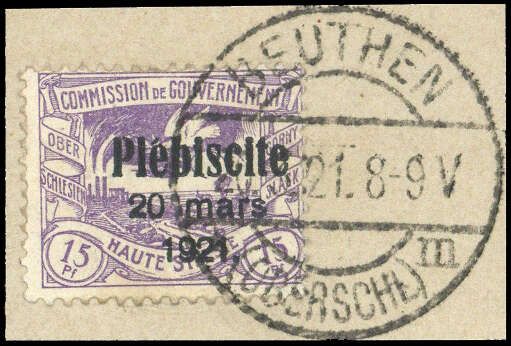 1921, 15 Pfennig Volksabstimmung mit Überdruck auf Briefstückchen