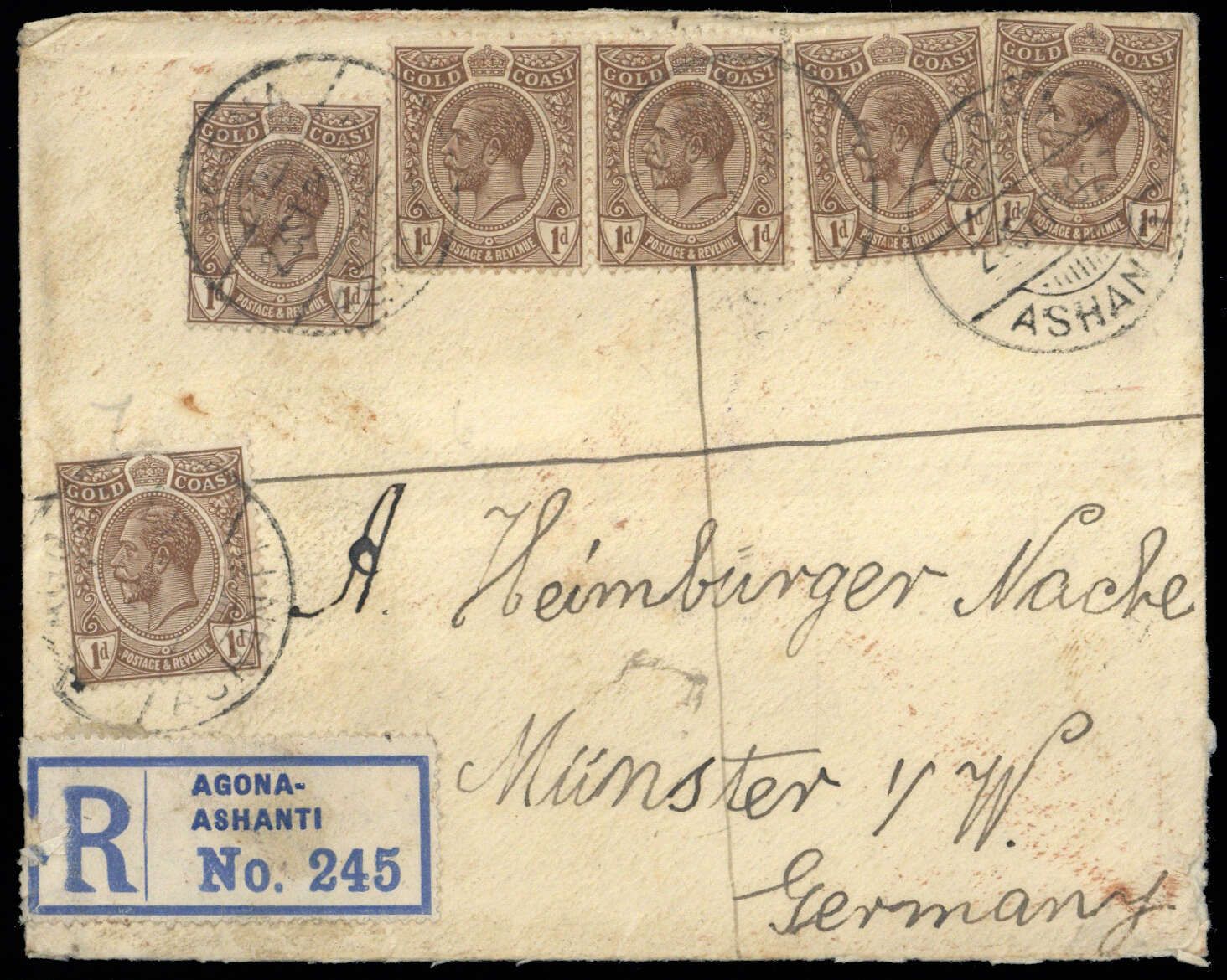 1922, 1 P braun (6, 3 Mängel), MeF auf Siegel-R-Brief, DB "AGONA ASHANTI 23 SEP 1927", Beförderungs- Altersspuren, Ak-DB "MÜNSTER 15.10.27"