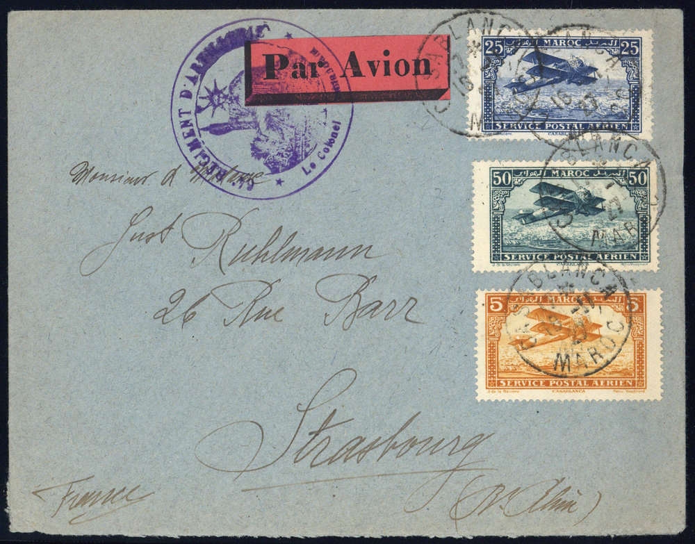 1922/26, 5, 25 und 50 C Flug, roter Aufkleber "Par Avion", Brief mit K1 "CASABLANCA 16-11 27", Beförderungs- Altersspuren, nach Strasbourg