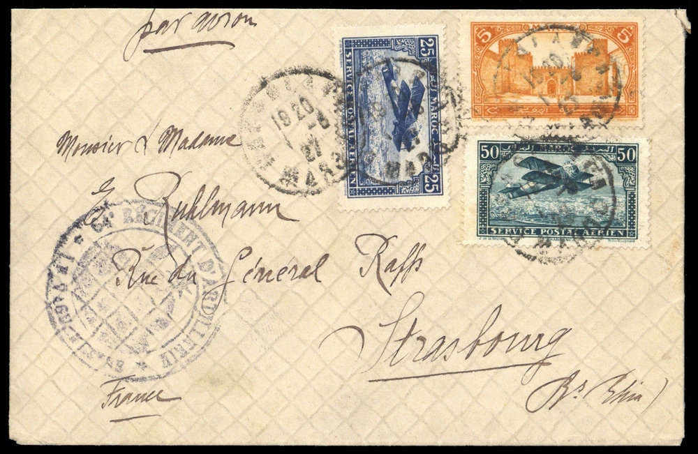 1922/26, 5, 25 und 50 C Flug, Luftpost-Brief mit K1 "CASABLANCA 1-6 27", Militär-Nebenstpl., Beförderungsspuren, nach Strasbourg